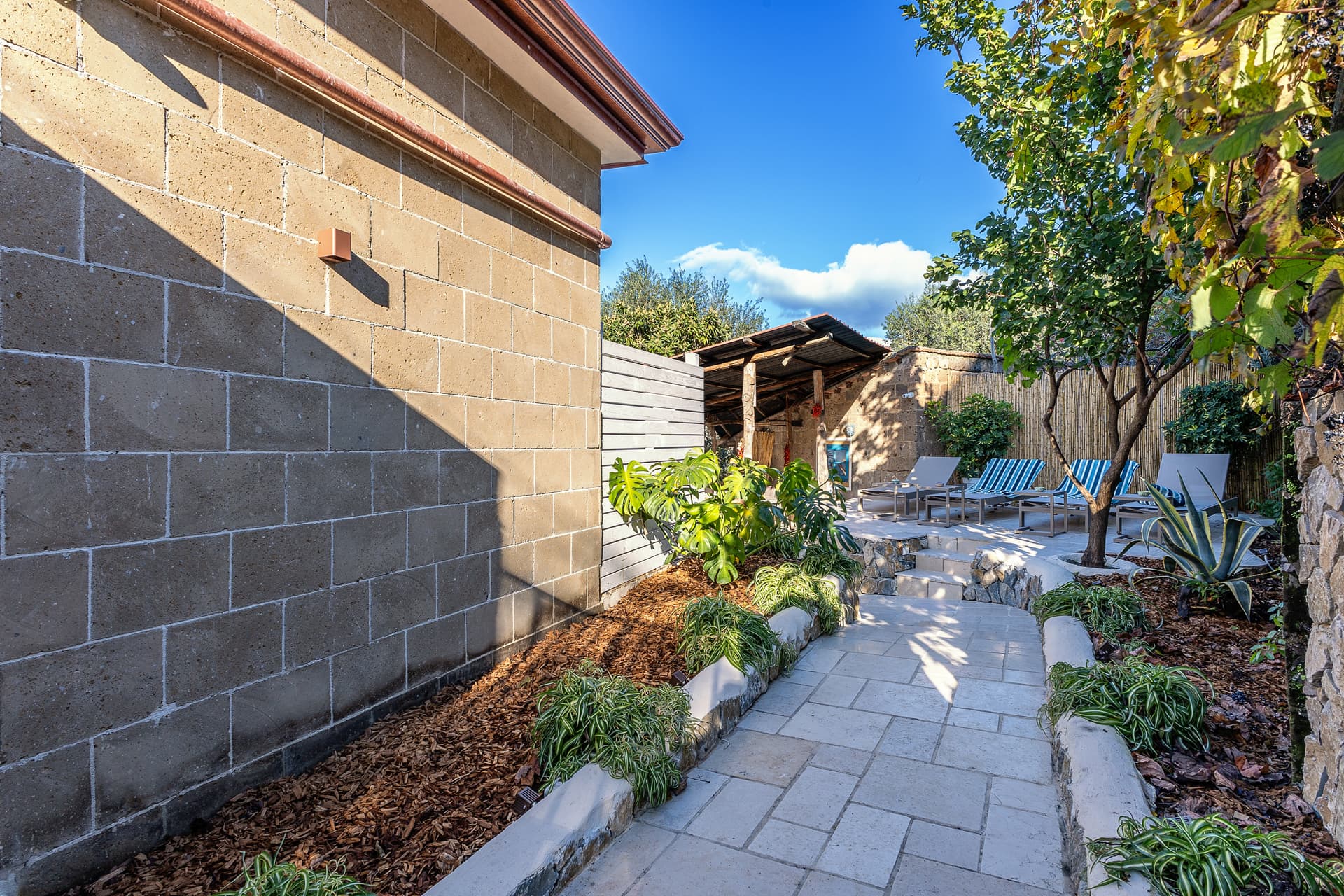 Outdoors, a well-maintained garden awaits with a courtyard and furnished relaxation areas for sunbathing or shaded lounging.