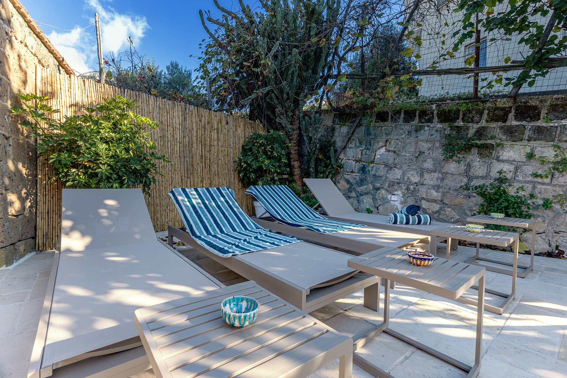 Relax in our lush Mediterranean courtyard with sun loungers and shaded seating areas.